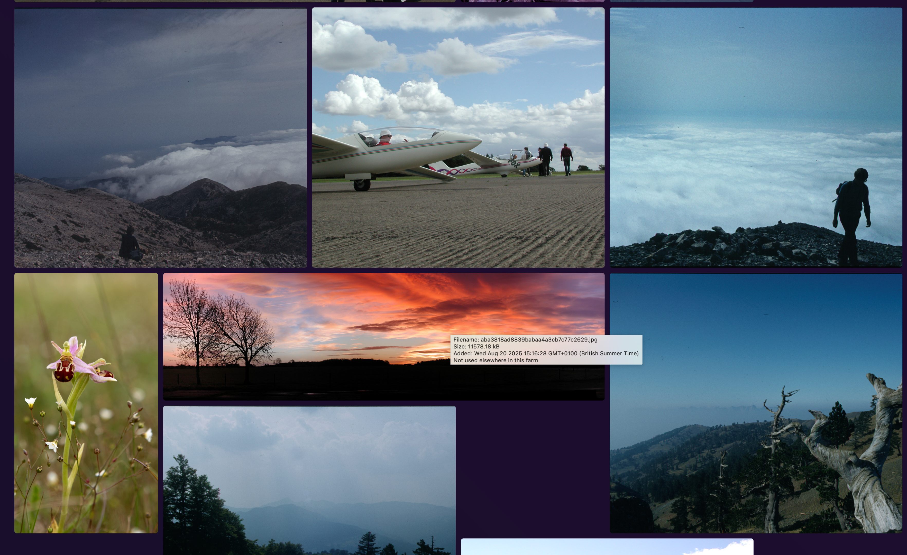 Hovering over an image will show its filename, size, date added, and if it is used in any other wiki within the wiki farm.